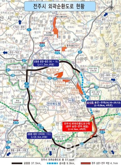 현재까지 완주 신리~전주 용정~용진을 잇는 37.5km 구간은 사업비 7,149억원을 들여 개통 운영 중이며, 전주 용진~우아(색장동) 9.9km 구간은 사업비 3964억 원을 들여 2029년 준공을 목표로 공사가 진행 중이다. 하지만 완주 상관~전주 색장 구간은 아직 착수 단계에 이르지 못해 외곽순환망의 기능이 반쪽에 그치고 있다는 지적이 이어져 왔다.