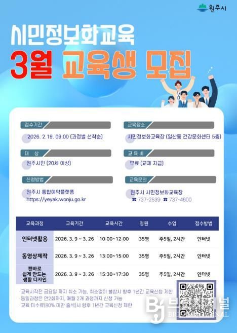 브릿지저널 윤나영 기자 | 원주시는 시민들의 디지털 활용 능력 향상과 정보 격차 해소를 위해 시민정보화교육 3월 수강생을 모집한다.