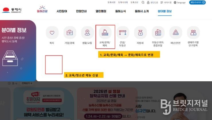 브릿지저널 윤나영 기자 | 동해시는 교육발전특구 시범지역 3년 차를 맞아 정보 사각지대를 해소하고 교육 정책의 체감도를 높이기 위해 3월 중 시 공식 누리집에 ‘교육/청소년’ 전용 메뉴를 신설·운영한다고 밝혔다.