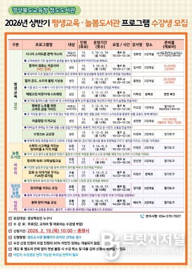 브릿지저널 정보영 기자 | 경상북도교육청 청도도서관(관장 조은희)은 2월 19일부터 지역주민을 대상으로 2026년 상반기 평생교육 및 늘봄도서관 프로그램 수강생을 모집한다.