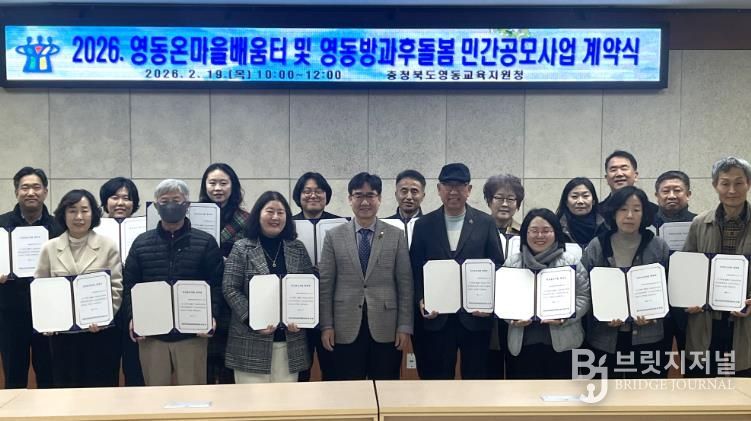브릿지저널 김경미 기자 | 충북영동교육지원청은 19일 대회의실에서 2026년 영동온마을배움터·영동방과후·돌봄 민간공모사업 계약식을 열고, 학교와 마을이 함께 학생의 삶과 배움을 잇는 교육·돌봄 체계를 본격 추진한다고 밝혔다.