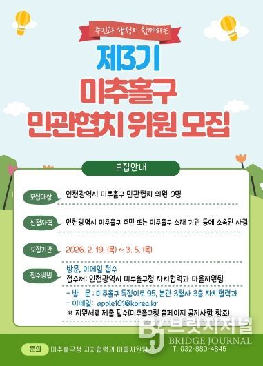 브릿지저널 김경미 기자 | 인천 미추홀구는 주민과 행정이 함께 지역 현안을 논의하고 해결하는 협치 기반을 강화하기 위해 제3기 민관협치위원회 위원을 공개 모집한다고 밝혔다.