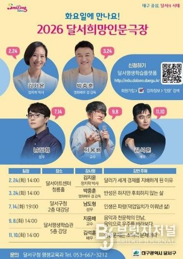 브릿지저널 김진석 기자 | 대구 달서구는 2월 24일 오후 2시 달서아트센터 청룡홀에서 김지윤 정치학 박사의 강연을 시작으로 '2026 달서희망인문극장'을 본격 운영한다.