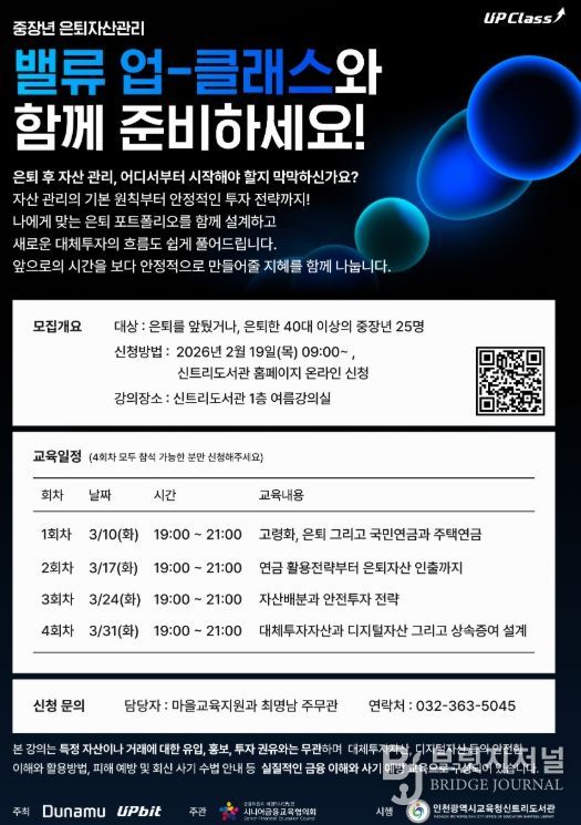 브릿지저널 김경미 기자 | 인천광역시교육청신트리도서관은 19일부터 시니어 은퇴자산 관리 교육 ‘자산관리 밸류-업 클래스’ 참여자를 모집한다.