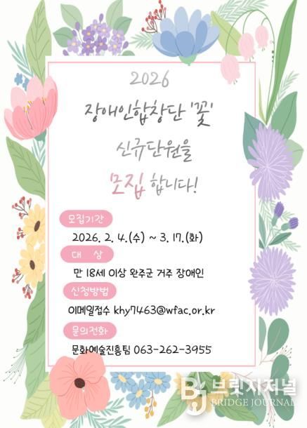 브릿지저널 윤나영 기자 | 완주문화재단은 장애인의 문화예술 참여 확대와 지속 가능한 예술 활동 기반 조성을 위해 '2026 완주장애인합창단 ‘꽃’' 단원을 모집한다.