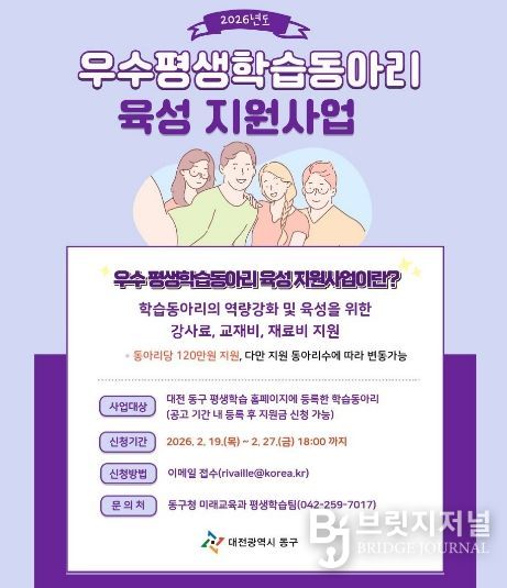 브릿지저널 정보영 기자 | 대전 동구는 학습공동체 활성화를 위해 ‘2026년 우수 평생학습동아리 육성 지원사업’ 신청을 19일부터 오는 27일까지 접수한다고 밝혔다.