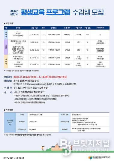 브릿지저널 정보영 기자 | 경상북도교육청 예천도서관(관장 김미연)은 지역 주민의 평생학습 지원을 위해 2026년 상반기 평생교육 프로그램 수강생을 모집한다.