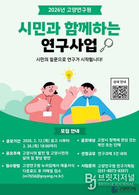 브릿지저널 김경미 기자 | 고양연구원은 시민과 함께 고양시의 미래를 설계하는 문제해결형 연구를 추진하기 위해 ‘시민과 함께하는 연구사업’ 공개 모집을 오는 2월 26일까지 진행한다.