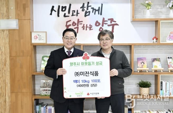 브릿지저널 김경미 기자 | 양주시는 최근 ㈜미진식품로부터 이웃돕기 성품으로 백미 10kg 100포(400만 원 상당)를 기탁받았다고 밝혔다.