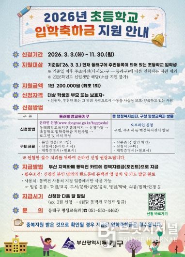지원 대상은 2026년 3월 3일 기준 부산 동래구에 주민등록이 되어 있는 초등학교 1학년 입학생이다.