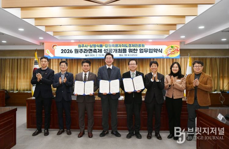 브릿지저널 윤나영 기자 | 원주시는 ‘2026 원주라면축제’의 성공적인 개최를 위해 19일 오후 2시, 시청 7층 투자상담실에서 삼양식품, 강원특별자치도경제진흥원과 업무협약을 체결했다.