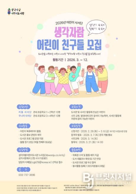 브릿지저널 윤나영 기자 | 생각자람어린이도서관은 어린이들이 책과 도서관을 가까이하는 도서관 지기로 성장할 수 있도록 어린이 사서단 ‘생각자람 어린이 친구들’을 운영한다.
