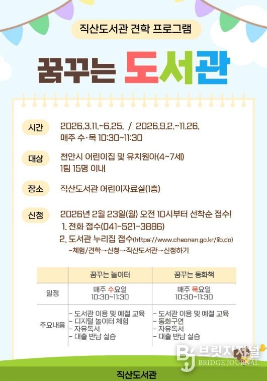 꿈꾸는 도서관은 어린이집과 유치원을 대상으로 운영되며, 견학 신청은 오는 23일 오전 10시부터 전화 또는 천안시도서관 누리집에서 선착순으로 진행된다.