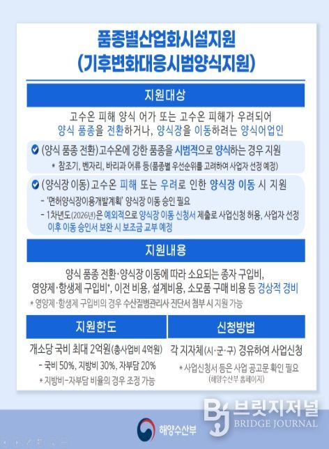 브릿지저널 정보영 기자 | 해양수산부는 기후변화에 선제적으로 대응하고 어가의 소득 안정을 도모하기 위해 2월 23일부터 3월 31일까지 ‘2026년 기후변화 대응 시범 양식 지원사업’ 대상 어가를 공모한다고 밝혔다.