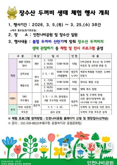 브릿지저널 김경미 기자 | 부평구는 오는 3월 5일부터 25일까지 인천나비공원과 장수산 일대에서 ‘장수산 두꺼비 생태 체험 행사’를 개최한다.