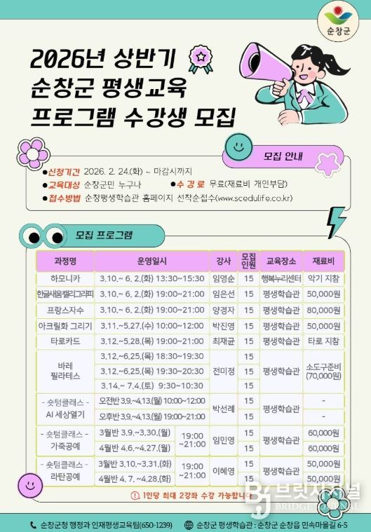 브릿지저널 윤나영 기자 | 순창군이 이달 24일부터 ‘2026년 상반기 평생교육 프로그램’ 수강생 모집을 시작한다.