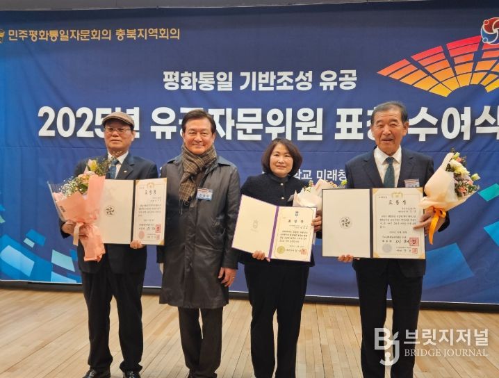 브릿지저널 김경미 기자 | 민주평화통일자문회의 보은군협의회 박헌열 협의회장과 윤석영 자문위원이 23일 서원대학교 미래창조관에서 열린 ‘2025년 민주평화통일자문회의 유공자문위원 표창 수여식’에서 의장(대통령) 표창을 수상했다.