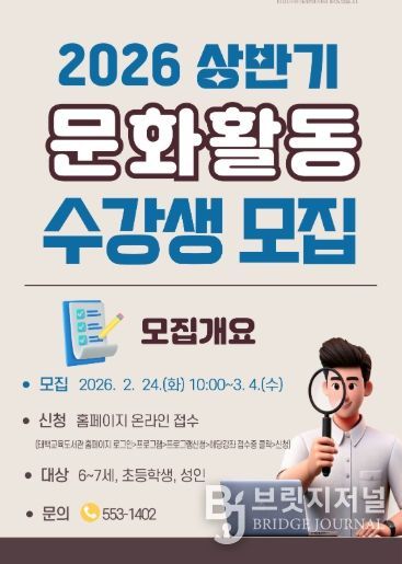 브릿지저널 윤나영 기자 | 태백교육도서관은 3월 18일부터 7월 8일까지 지역 내 유아·초등학생·성인을 대상으로 ‘2026년 상반기 문화활동강좌’를 운영한다.