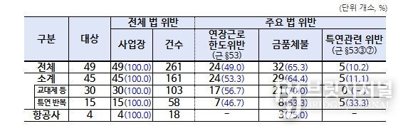 감독 결과, 4개소 전 사업장에서 총 18건의 법 위반 사항이 적발됐다. 주요 위반 내용으로는 ▴브리핑 시간 등을 제외하고 순수 비행시간만 근로시간으로 인정하는 등 야간근로수당 미지급 3개소(75.0%, 약 7억원), ▴기간제 승무원을 차별하여 비행수당 미지급 1개소(25.0%, 약 5억 5천만원), ▴산후 1년 미경과자 시간외 근로 한도 초과 2개소(50.0%) 등이 확인됐다.