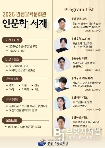 브릿지저널 윤나영 기자 | 강릉교육문화관은 오는 3월부터 8월까지 총 6회에 걸쳐 청소년 및 성인을 대상으로 ‘2026년 인문학 서재’를 운영한다.