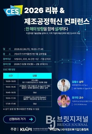 브릿지저널 김진석 기자 | 대구광역시는 2월 26일 오후 4시, 대구기계부품연구원 글로벌홀에서 ‘CES 2026 리뷰·제조공정혁신 컨퍼런스’를 개최한다.