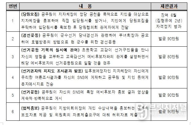 또한, 지난 1월에는 공무원 등의 선거관여행위를 예방하기 위하여 중앙행정기관·지방자치단체·교육청, 공공기관에 관련 법규와 주요 위반사례를 안내하고,'공무원의 선거관여행위 금지 안내 책자'를 배부했으며, 행정안전부가 개최한'중앙·지방 정책협의회'에 참석하여 중앙행정기관, 지방자치단체 등을 대상으로 공무원의 선거관여행위에 대한 적극적인 단속의지를 표명하는 등 다양한 방식으로 예방·안내활동을 전개하고 있다.