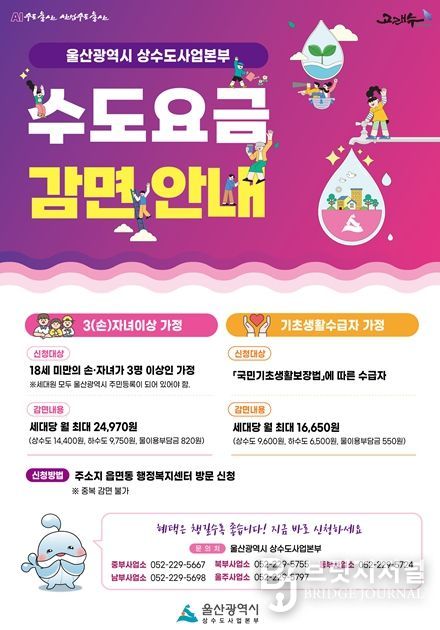 브릿지저널 윤나영 기자 | 울산시 상수도사업본부는 지난해에 이어 올해도 관내 3자녀(손자녀 포함) 이상 가정 및 기초생활수급자를 대상으로 상·하수도 요금 감면 혜택을 지원한다고 밝혔다.