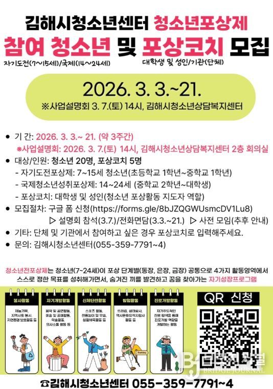 브릿지저널 김경미 기자 | 김해시청소년센터는 오는 3월 3일부터 21일까지 ‘2026년 청소년포상제’에 참여할 청소년과 이들의 활동을 지원할 포상코치를 공개 모집한다.