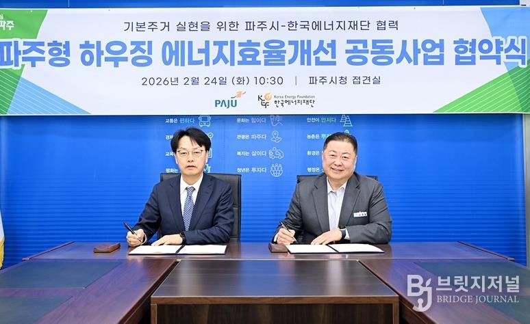 브릿지저널 김경미 기자 | 파주시는 지난 24일 한국에너지재단과 ‘기본주거 실현을 위한 파주형 하우징 에너지효율개선 공동사업’업무협약을 체결했다.