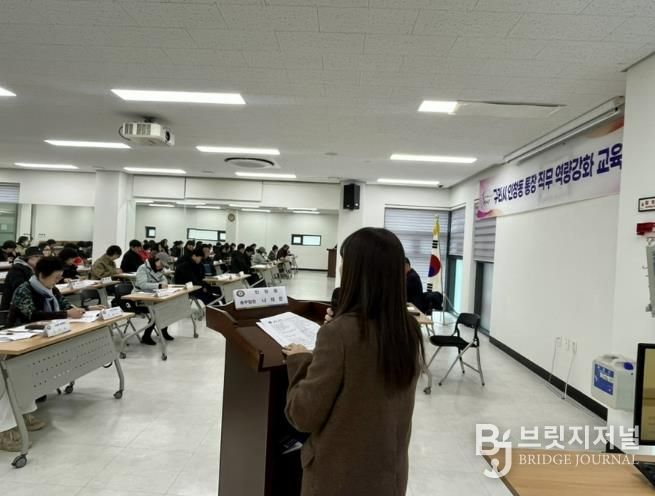 브릿지저널 김경미 기자 | 구리시 인창동 행정복지센터는 지난 24일 인창동 행정복지센터에서 통장 41명을 대상으로 실무역량 강화를 위한 직무교육을 했다고 밝혔다.