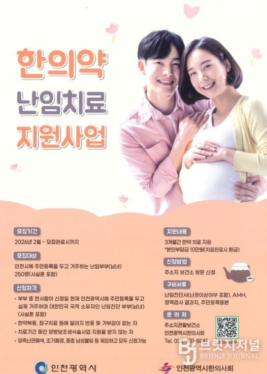 브릿지저널 김경미 기자 | 연수구는 난임으로 어려움을 겪는 부부들의 건강한 임신과 출산을 돕기 위해 ‘2026년 한의약 난임치료 지원사업’ 참여자를 모집한다.