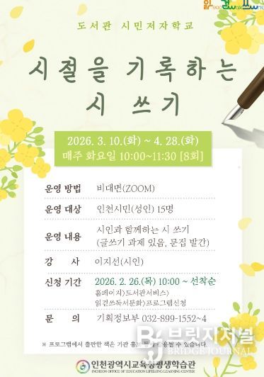 브릿지저널 김경미 기자 | 인천광역시교육청평생학습관은 시민의 문학적 감수성을 함양하고 인문학적 소양을 넓히기 위하여, 오는 26일부터 ‘시절을 기록하는 시 쓰기’ 성인 프로그램 수강생을 모집한다.