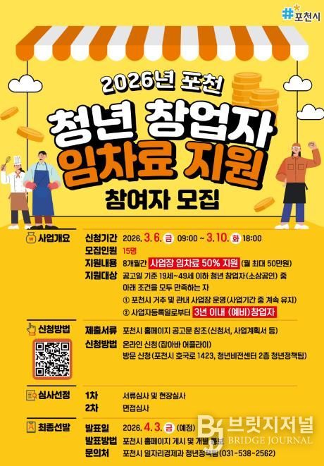브릿지저널 김경미 기자 | 포천시는 청년 창업자의 안정적인 창업 환경 조성과 창업 지속 가능성 제고를 위해 '2026년 청년 창업자 임차료 지원사업' 참여자를 2026년 3월 6일부터 10일까지 모집한다.