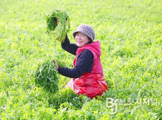 브릿지저널 김경미 기자 | 25일 경남 함양군 백전면 백운리 윗 새재농원 시설하우스에서 홍정표씨가 고랭지 지하암반수로 재배해 수확한 청정 밭미나리를 들어 보이고 있다. 이곳 백운산 자락에서 자란 미나리는 해발 600m에서 친환경적으로 재배해 향이 진하며 줄기가 부드럽고 아삭한 식감이 일품이다.