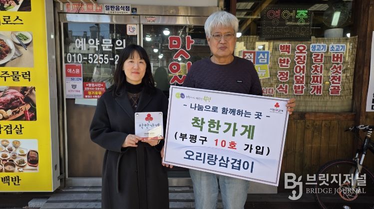 브릿지저널 김경미 기자 | 부평구는 25일 청천동 소재 오리·삼겹 전문 음식점 ‘오리랑삼겹이’가 부평구 10호 착한가게로 신규 가입했다고 밝혔다.