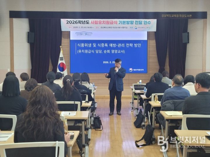 브릿지저널 정보영 기자 | 경북교육청은 25일 의성군에 있는 경상북도교육청 의성도서관 시청각실에서 도내 교육지원청 유치원 급식 담당자와 순회 영양교사 등 40여 명을 대상으로 ‘2026학년도 사립유치원 급식 기본 방향 전달 연수’를 개최했다고 밝혔다.
