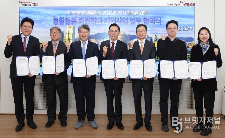 브릿지저널 김경미 기자 | 꿈이 모이는 도시, 미래를 그리는 강남구가 퇴원 이후 돌봄 공백을 줄이고 지역사회 중심의 돌봄 체계를 강화하기 위해 2월 25일 구청에서 관내 6개 의료기관과 '통합돌봄 퇴원환자 지원사업' 추진을 위한 업무협약(MOU)을 체결했다. 협약 기관은 삼성서울병원, 연세대학교의과대학 강남세브란스병원, 강남베드로병원, 나누리병원, 메드렉스병원, 강남구립행복요양병원이다.