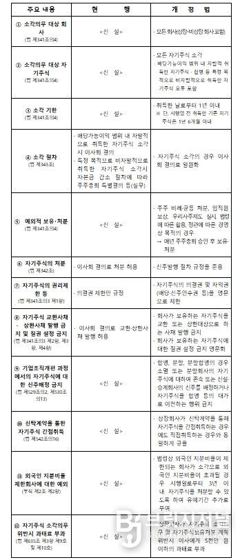 또한, 개정안은 모든 자기주식의 소각을 ‘이사회 결의’로 하도록 하여 소각 절차를 간소화했고, 법령상 외국인 지분비율이 제한되는 회사가 소각으로 외국인 지분비율이 초과될 경우 시행일로부터 3년 이내 자기주식을 처분할 수 있도록 하여 유예기간을 추가로 부여했다.