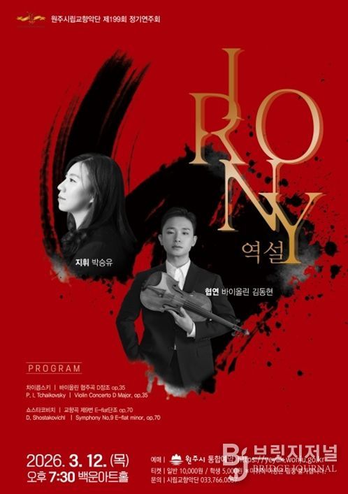 브릿지저널 윤나영 기자 | 원주시립교향악단은 다음 달 12일 오후 7시 30분 백운아트홀에서 제199회 정기연주회 ‘IRONY 역설’을 개최한다.