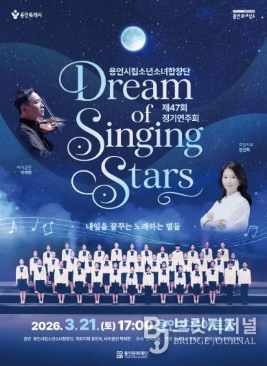 브릿지저널 김경미 기자 | 용인문화재단은 오는 3월 21일 용인포은아트홀에서 용인시립소년소녀합창단 제47회 정기연주회'Dream of Singing Stars'를 개최한다고 밝혔다.