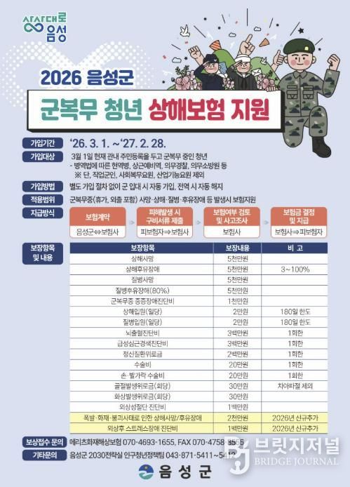 브릿지저널 김경미 기자 | 음성군은 군복무 중인 지역 청년들이 예기치 못한 사고로부터 충분한 보장을 받을 수 있도록 ‘2026년 군복무 청년 상해보험 지원사업’을 추진한다고 밝혔다.