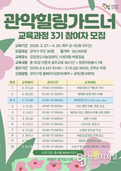 ‘관악 힐링 가드너’는 단순한 이론 교육을 넘어 주민들이 직접 동네 녹지를 가꾸고 돌보는 실천형 마을 정원사를 양성하는 사업이다. 구는 지난 2025년 1·2기 교육 당시 높은 경쟁률과 만족도를 기록하며 지역 내 정원문화 확산을 위한 기반을 성공적으로 다진 바 있다.