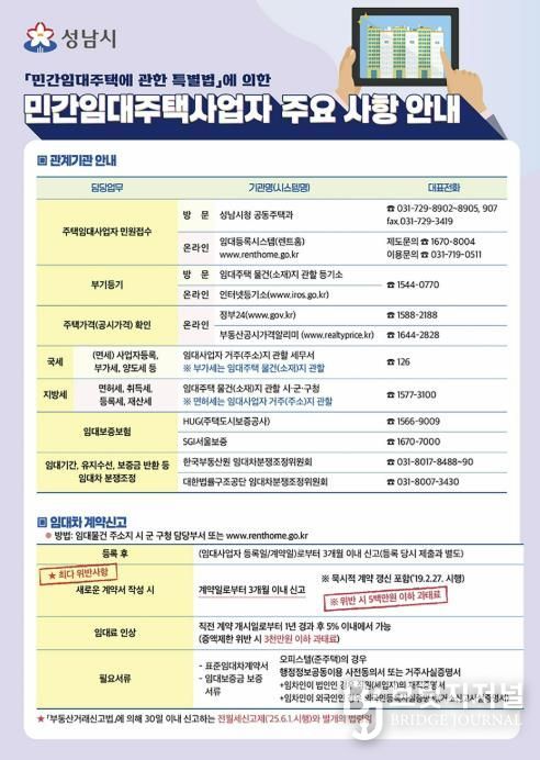 브릿지저널 김경미 기자 | 성남시는 잦은 법령 개정과 제도 변화로 혼란을 겪는 지역 임대사업자를 지원하기 위해 ‘등록 임대사업자 주요 준수사항’ 안내문을 제작해 발송할 예정이라고 밝혔다.