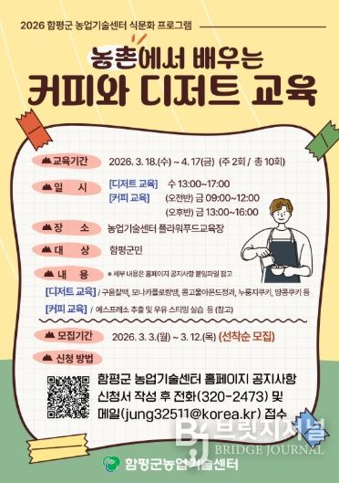 브릿지저널 김경미 기자 | 전남 함평군이 군민을 대상으로 창업·소규모 카페 운영에 필요한 실무 역량 교육을 제공한다.
