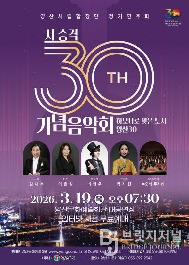 브릿지저널 김경미 기자 | 양산시는 오는 2026년 3월 19일 목요일 저녁 7시 30분부터 90분간 양산문화예술회관 대공연장에서 시 승격 30주년을 기념하는 양산시립합창단 정기연주회 ‘하모니로 빚은 도시 양산30’을 개최한다.