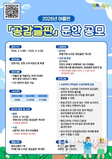 브릿지저널 김경미 기자 | 부평구가 3월 3일부터 4월 3일까지 한 달간 ‘2026년 여름편 공감글판’ 문안을 공모한다.