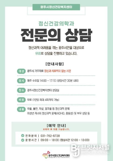 브릿지저널 김경미 기자 | 광주시정신건강복지센터는 지역 주민의 정신건강 증진과 심리지원 강화를 위해 2월부터 정신건강의학과 전문의 무료 상담을 운영하고 있다고 27일 밝혔다.