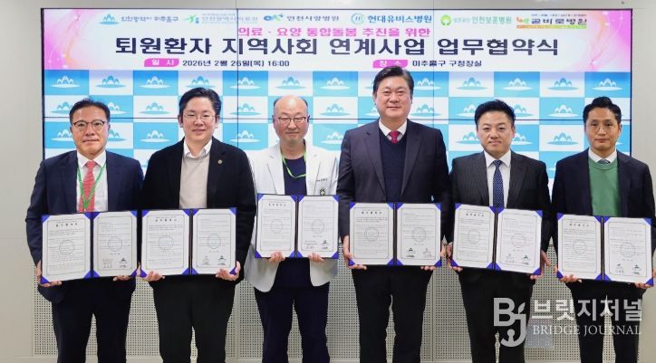 브릿지저널 김경미 기자 | 인천 미추홀구는 지난 26일 지역 내 5개 의료기관과 ‘퇴원 환자 지역사회 연계사업’ 추진을 위한 업무협약을 체결했다.