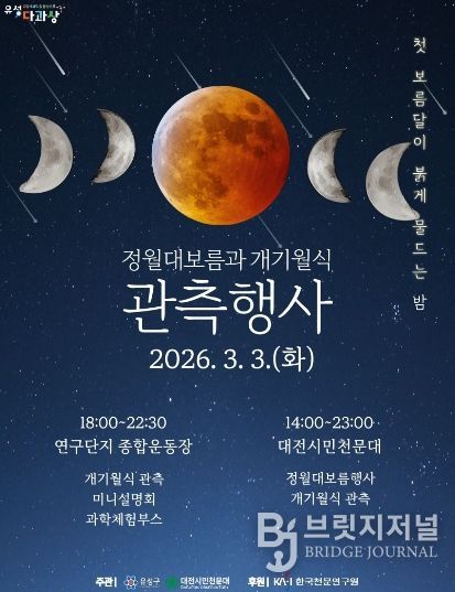 브릿지저널 정보영 기자 | 대전 유성구는 3월 3일 대덕연구단지 운동장에서 대전시민천문대(대장 최형빈)와 함께 ‘2026 정월대보름 및 개기월식’ 행사를 개최한다.