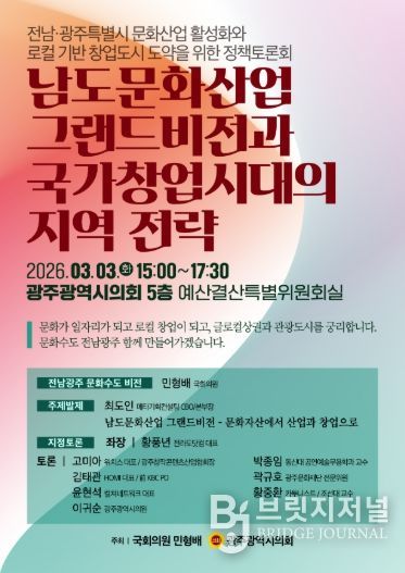 브릿지저널 김경미 기자 | 전남·광주 문화산업의 중장기 발전 전략과 로컬 기반 창업도시 도약 방안을 모색하는 정책토론회가 열린다.